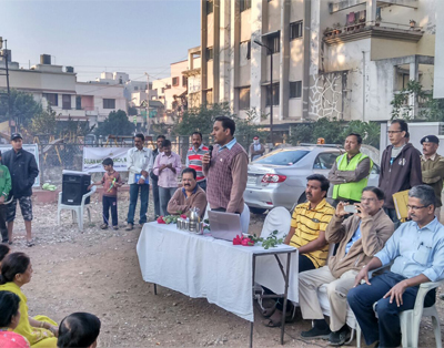 NMC Commissioner Shri Gedam addressing our volunteers at Ambika Nagar.