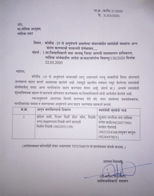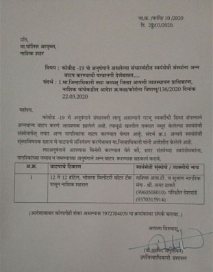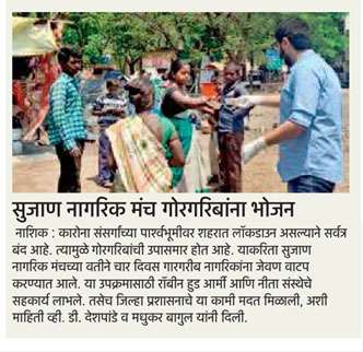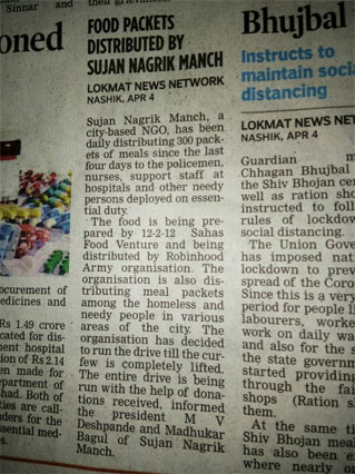 सुजाण नागरिक मंच आणि नाशिक इन्फॉर्मेशन टेक्नॉलॉजी असोसिएशन (निटा) यांच्या संयुक्त विद्यमाने या Covid-19 योध्यांना अन्न पाकिटे पुरवण्याची योजना हाती घेतली आहे. महात्मा नगर येथील ट्वेल टू ट्वेल (12 to 12) साहस फुड व्हेंचर्स, हॉटेल ऋषी यांनी अन्न पाकीटे तयार करून योग्य जागी पोहचवण्याची जबाबदारी घेतली आहे.