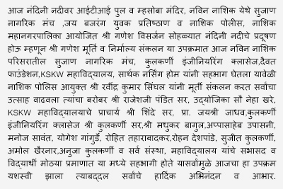 मा. नाशिक पो.आयुकत साहेब यांनी आपल्या भेटित गणपती उत्सवात स्वच्छता व मुतिंसंकलन व सुरक्षा सर्व मोहिम यशस्वी झाल्या बद्दल सर्व संस्था चे व नागरिकांचे व स्वयंमसेवक व सर्व कमंचारी यांचे आभार मानतांना गोदा व नंदिनी संवर्धन मोहीम / स्वच्छता व