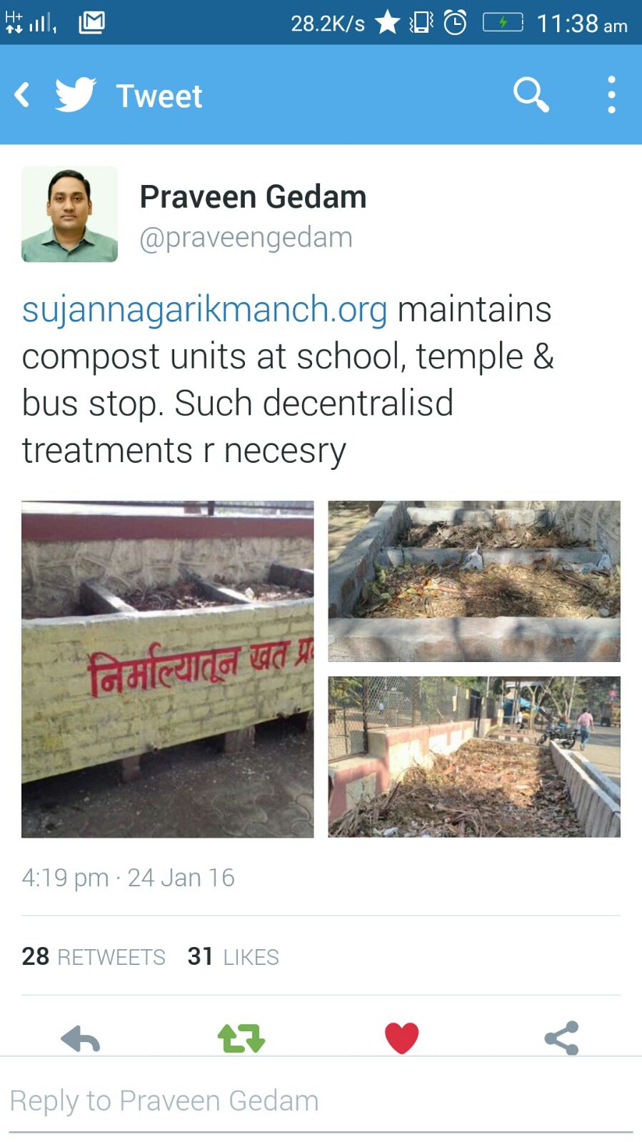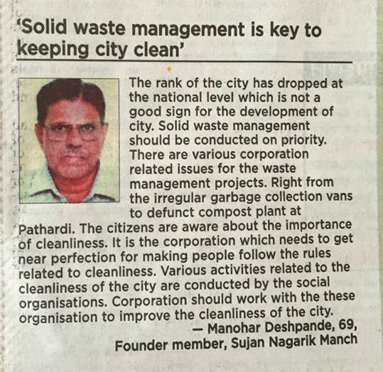 "Solid waste management is the biggest challenge of the world today.Refuse,reduce,reuse & recycle are the main ways to protect environment while handling it.By beautifying the city using the compost made out of bio-degradable waste is the most sensible environment friendly solution for waste management.By having a positive outlook with meaning-full actions towards society's challenges,citizens can create a ripple effect & inspire everyone.Join Sujan Nagarik Manch for such initiatives on various issues.Be proud of our city and help making it a better living place."